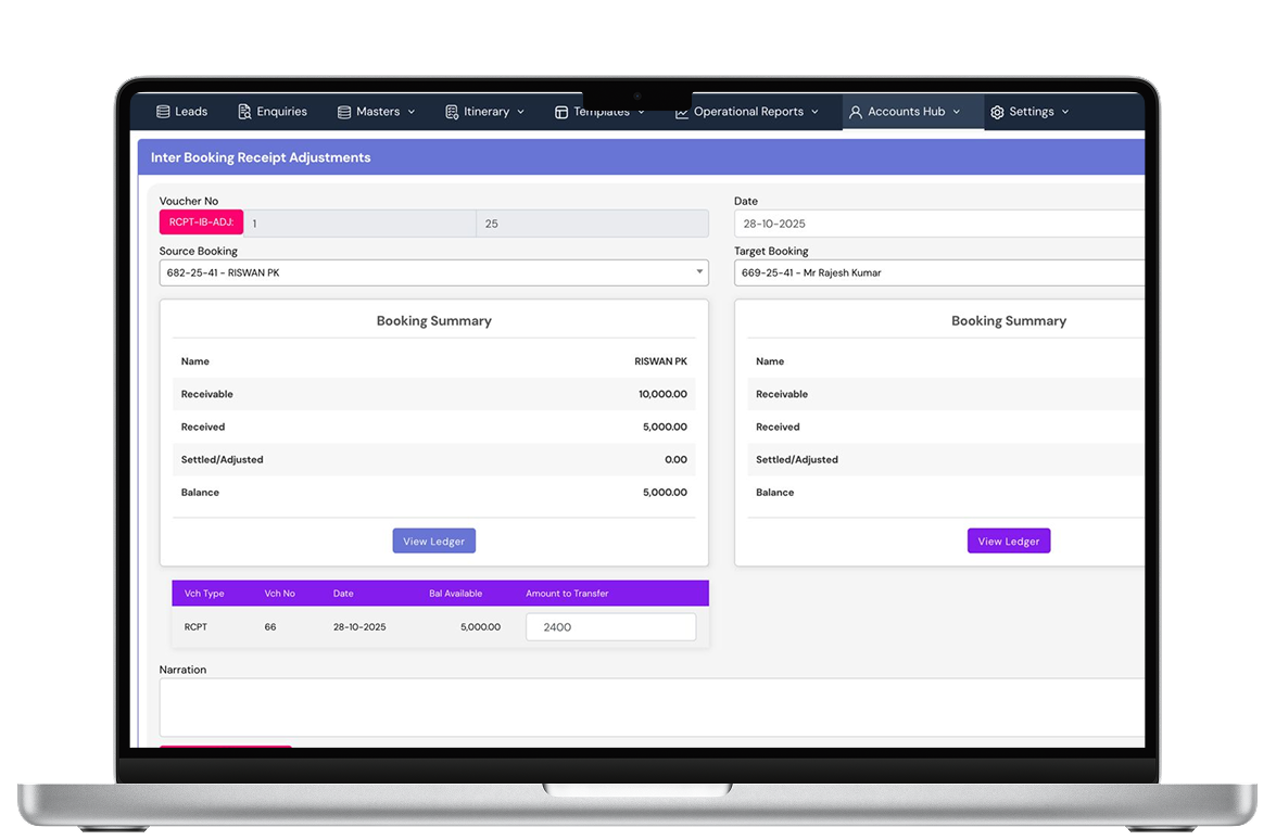 For integrated tour and office accounting with auto-generated booking entries, receipts, payments, invoicing, ledgers, and reporting functionalities.