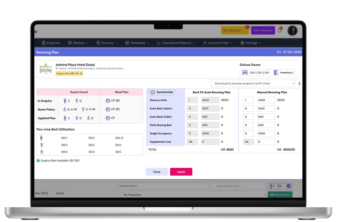 Tariff applied factoring the meal plan in the enquiry, selected room’s meal plan, mandatory dinner dates, and infants on FOC basis. Option available for manual rate adjustments if necessary.