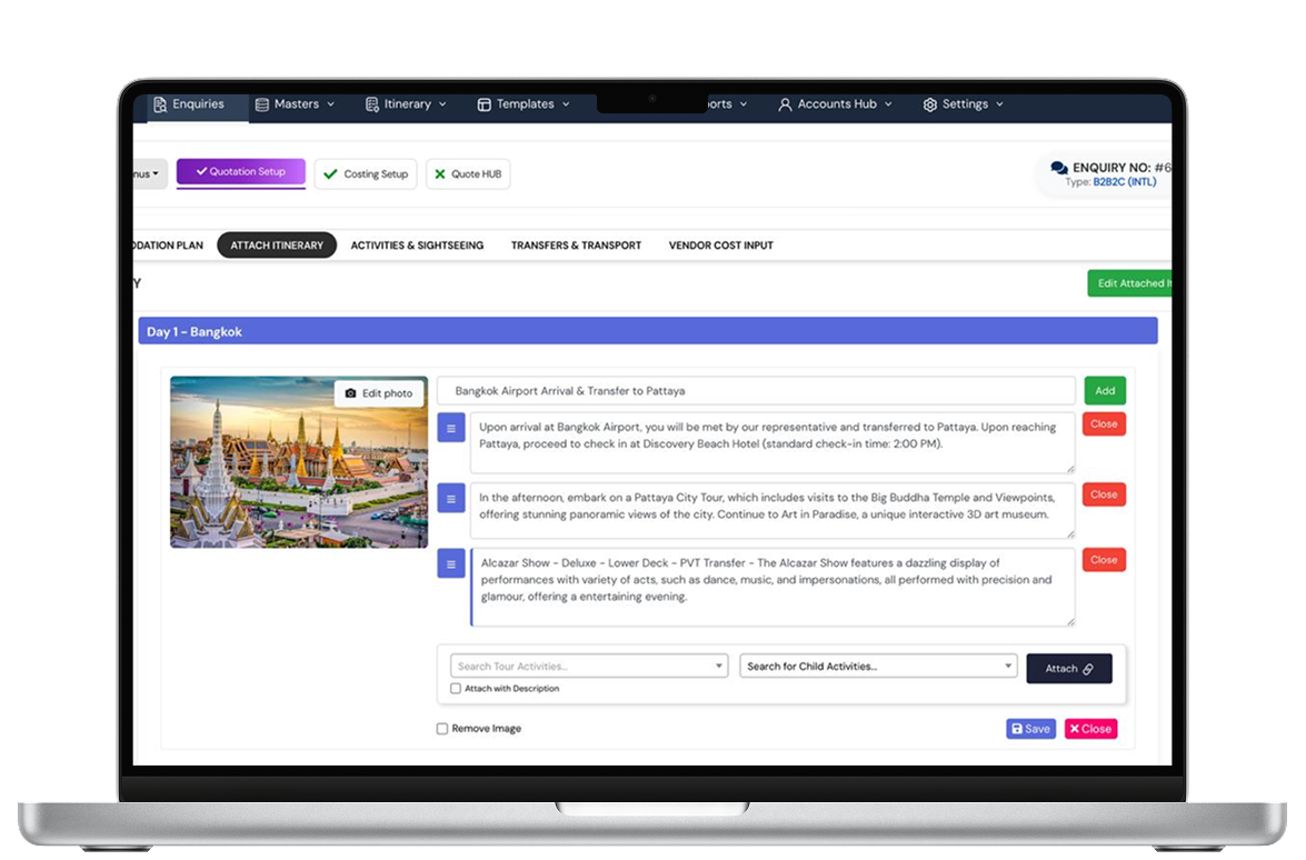 Creating a quotation or itinerary manually often takes hours of formatting, image selection, and cost calculations. With Tour Matrix, you simply enter package details, and the system instantly generates a polished, branded document—cutting down hours of work to just minutes.